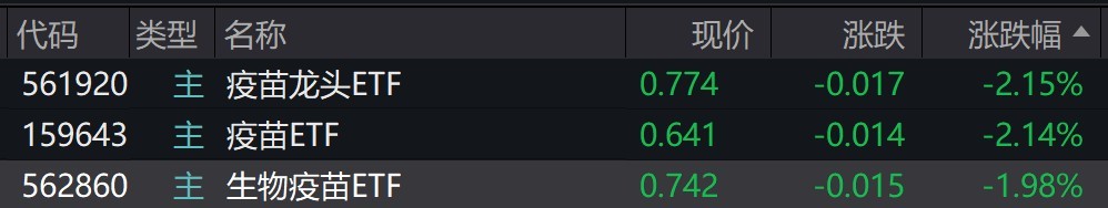 疫苗概念股走弱,智飞生物、沃森生物、康泰生物跌超3%。